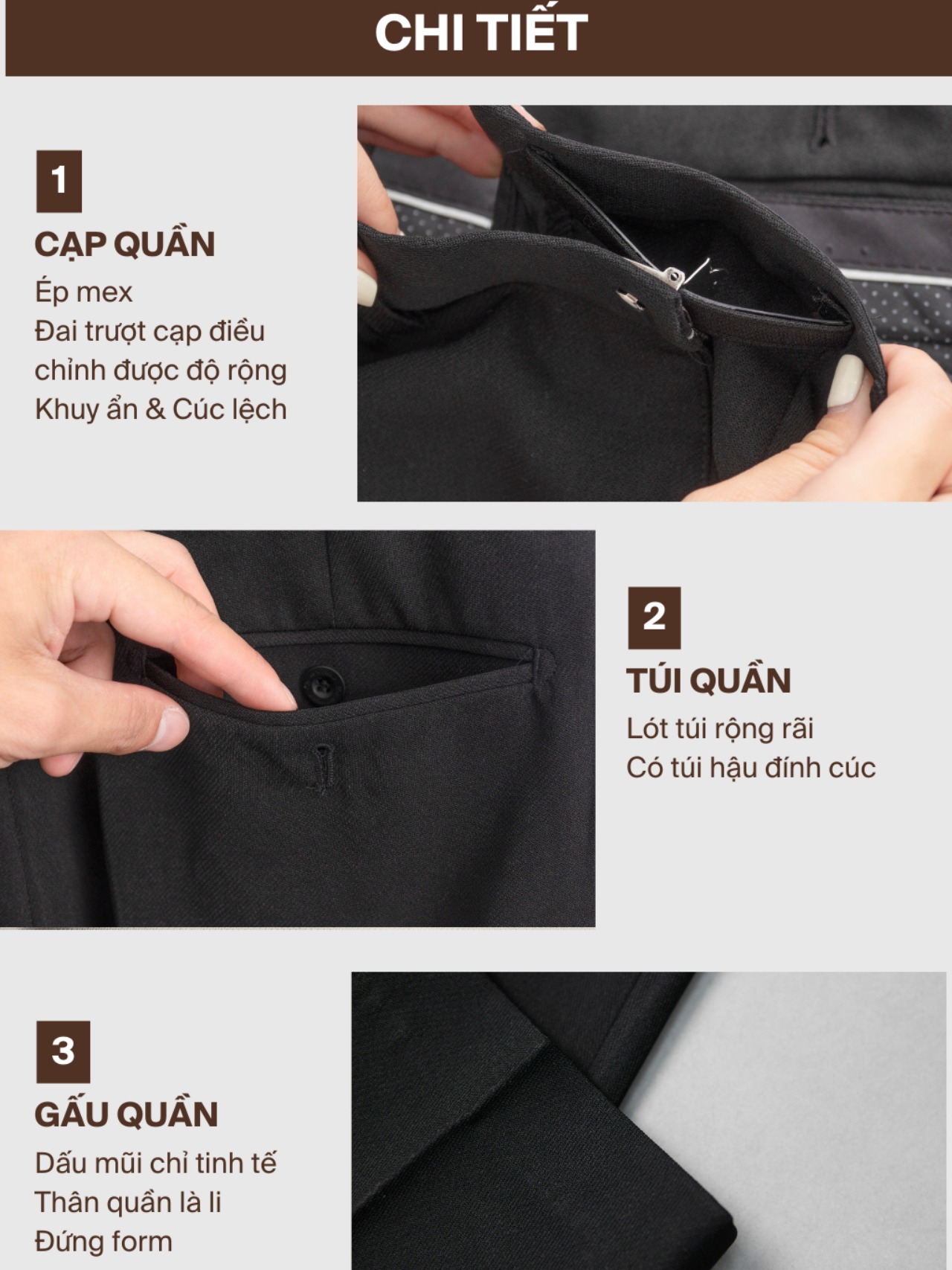 - Thiết kế quần âu sidetab: 1 cúc cài, kèm đai khuy xương cá 2 bên sườn, chiết ly tinh tế tạo cảm giác thoải mái cho người mặc